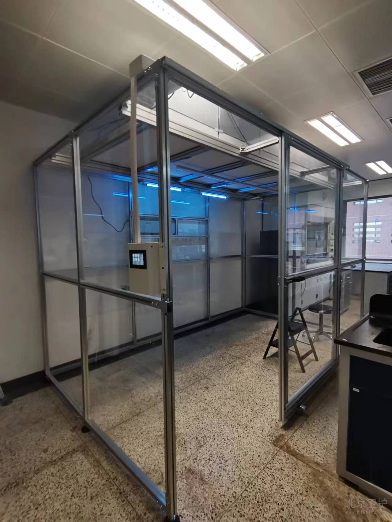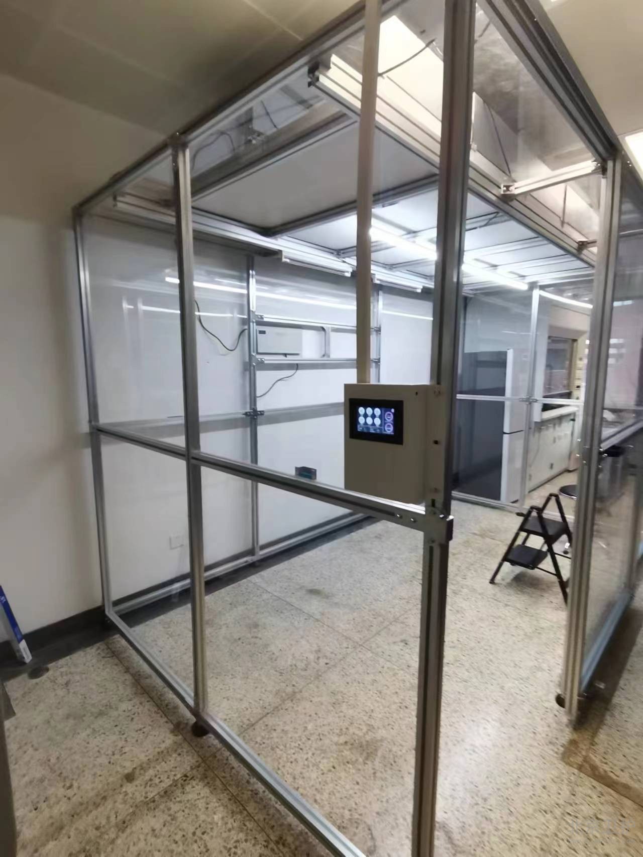 9月份我公司接到此項(xiàng)目后便抓緊時(shí)間出具相關(guān)方案、設(shè)計(jì)圖紙,經(jīng)過不斷的溝通和改動(dòng),最終確定施工方案。此單位潔凈棚設(shè)計(jì)面積20平米,主體材質(zhì)為鋁型材,隔離板使用亞格力板,頂部配有紫外線燈輔助殺菌,過濾系統(tǒng)為百級(jí)凈化模塊,并配有我公司研發(fā)的控制系統(tǒng)。從最初的方案設(shè)計(jì)、安裝施工,到最后的驗(yàn)收,總工期為10個(gè)工作日。