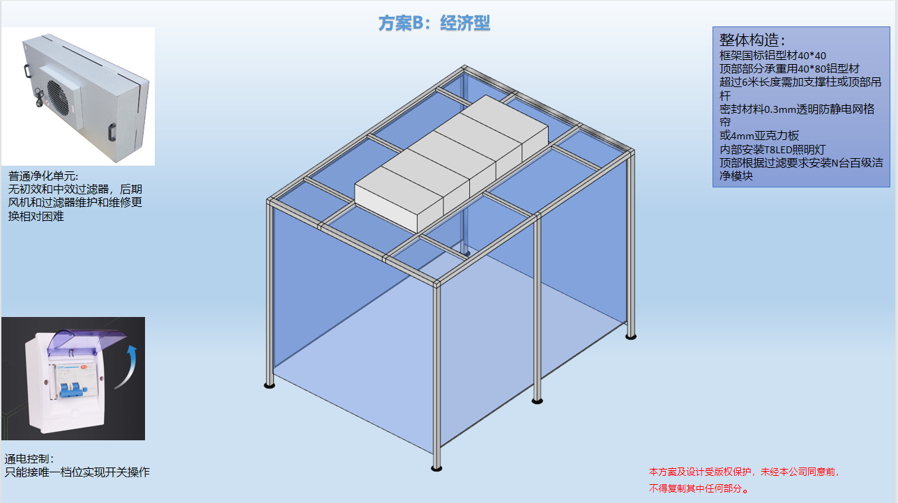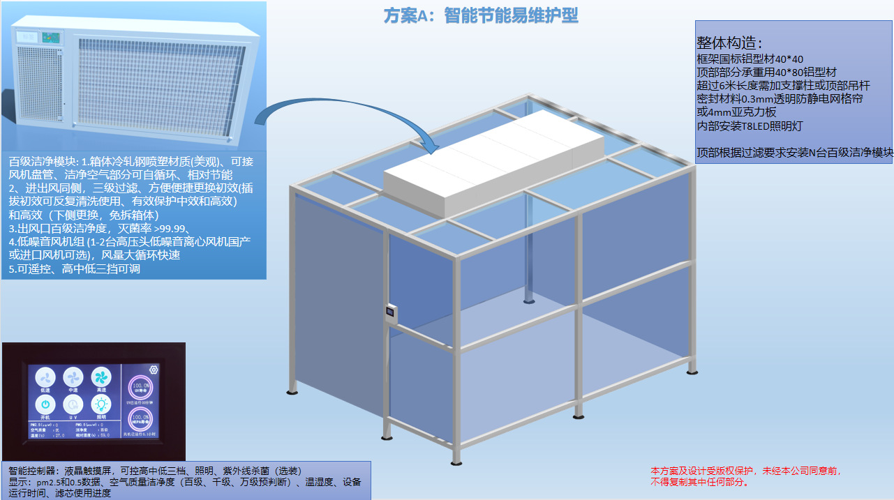 2.與土建式或裝配式百級(jí)潔凈室相 比,投資少,見(jiàn)效快,安裝簡(jiǎn)便,運(yùn)行費(fèi)用低。