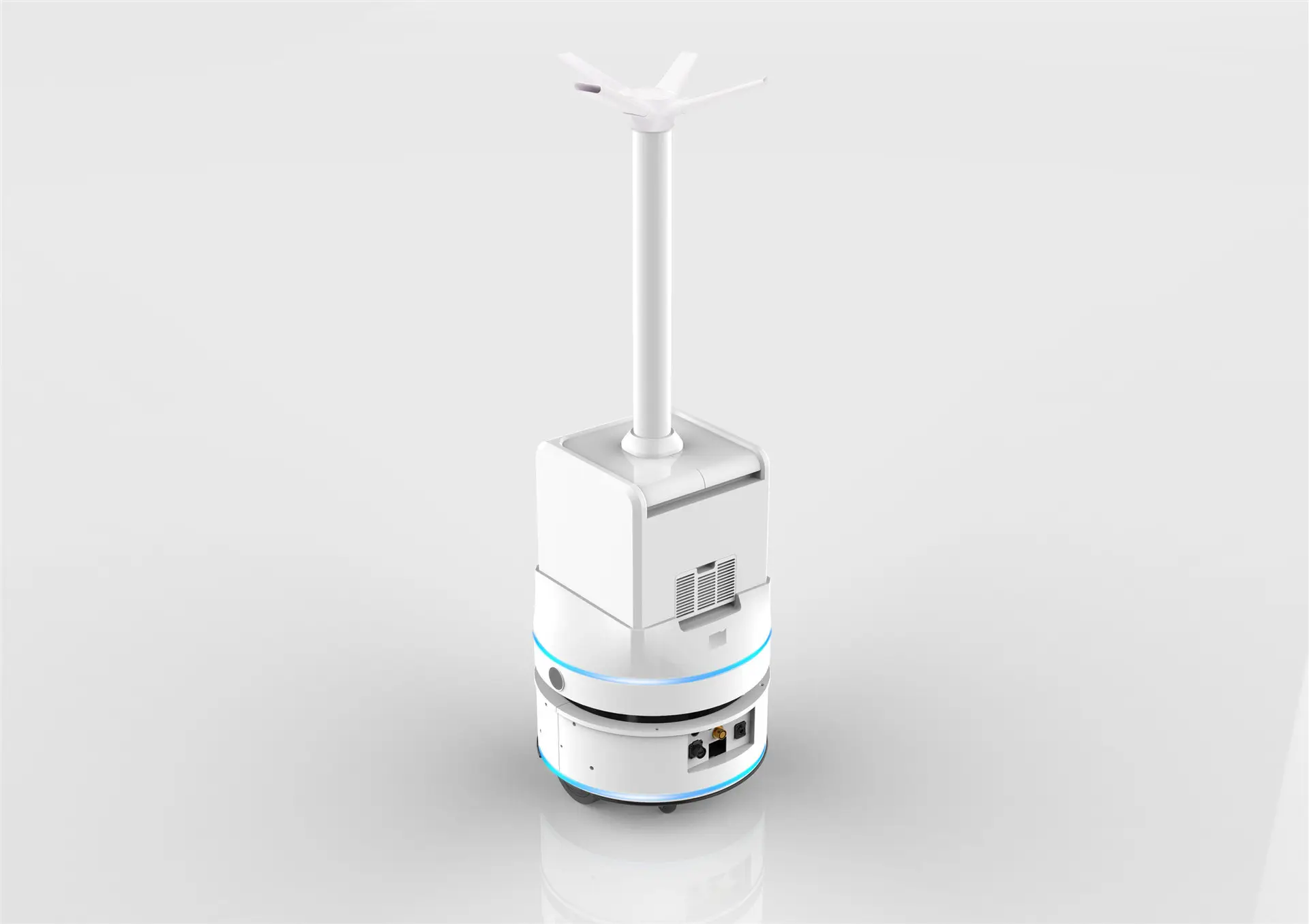 消毒防疫機器人簡稱消毒機器人,機器人為載體,在機器人內部裝置消毒系統,有霧化消毒機器人、紫外線消毒機器人、等離子消毒機器人、強光脈沖消毒機器人等。其中霧化消毒機器人應用最為普遍,霧化消毒機器人是將消毒霧化,產生消毒氣體,利用機器人的氣動系統將消毒氣體快速的在室內空間擴散,增加消毒的覆蓋面和均勻性,能有效、無死角地殺滅空氣中的致病微生物,消毒機器人能夠根據設定的路線自動、高效、精準的對室內進行消毒防疫。